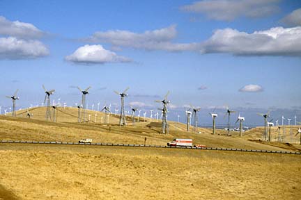 Electricity-generating windmills in California; view from distance.